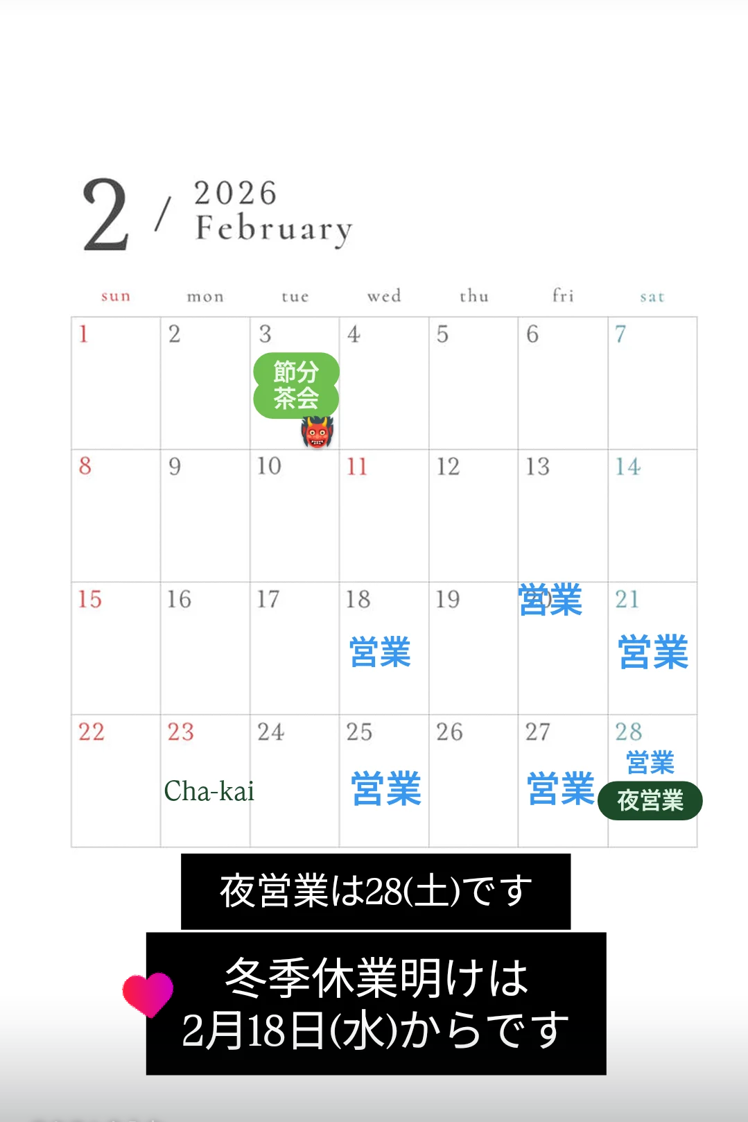 2月営業日のお知らせ