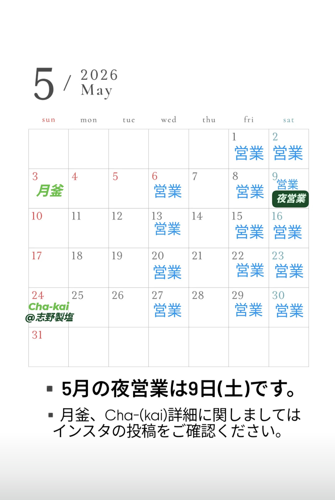 5月営業日のお知らせ
